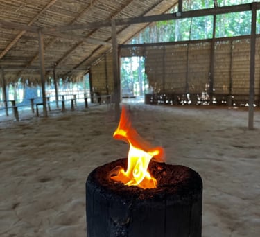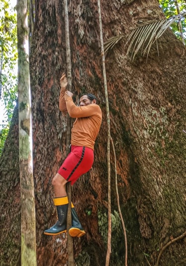 À noite, a experiência se aprofunda com o pernoite na floresta — um momento único de conexão com os sons, aromas e o ritmo natural da Amazônia.