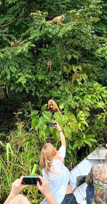 O dia começa com um dos cenários mais encantadores da Amazônia: os igarapés do Rio Ariaú, explorados em canoa. A experiência segue com interação com botos e visita a uma casa de farinha, onde é possível conhecer práticas tradicionais da cultura local.