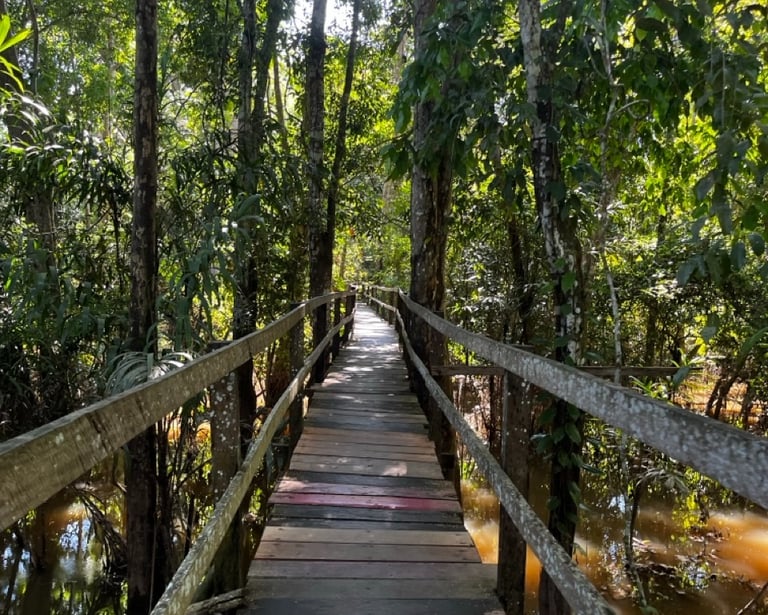 O início da expedição revela alguns dos cenários mais icônicos da região. A navegação começa com o famoso encontro das águas, seguido pela imersão no Parque Ecológico do Janauari, onde a trilha suspensa permite caminhar entre as arvores da floresta alagada.